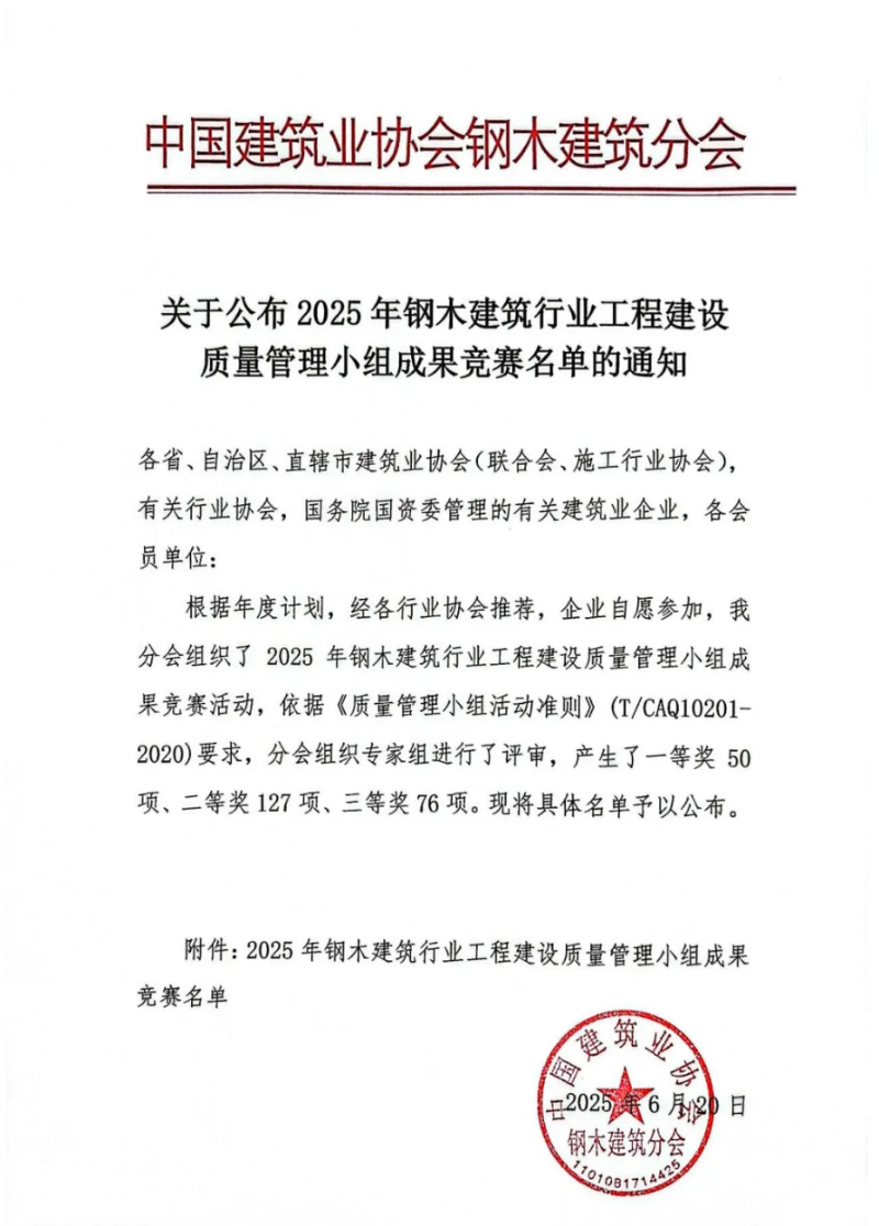近日,在中國建筑業(yè)協(xié)會鋼木建筑分會主辦的2025年鋼木建筑行業(yè)工程建設(shè)質(zhì)量管理小組成果競賽中,中建材鋼構(gòu)公司憑借卓越的質(zhì)量管理成果和創(chuàng)新實踐,一舉斬獲多項榮譽,充分彰顯了其在行業(yè)內(nèi)的領(lǐng)先地位和綜合實力。